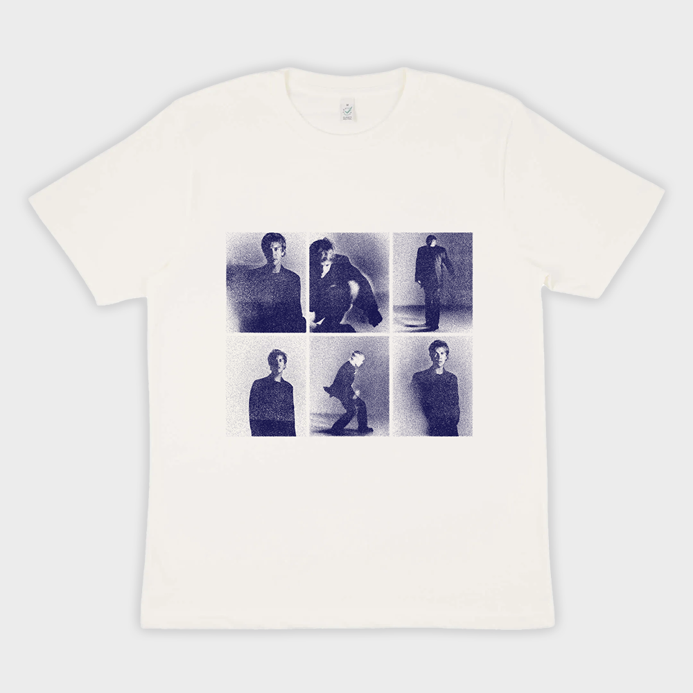 Off-white t-shirt featuring different picture slides from Tom Odell in blue